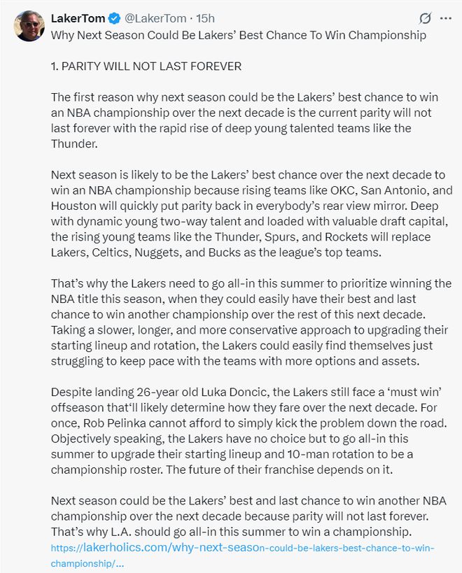 北京时间6月13日,湖人媒体Laker Tom记者汤姆-考德尔长文解析洛杉矶湖人队下赛季将是未来10年唯一的夺冠机会,他列举了四个理由,每一篇都是长篇大论,这里我就列出中心思想。